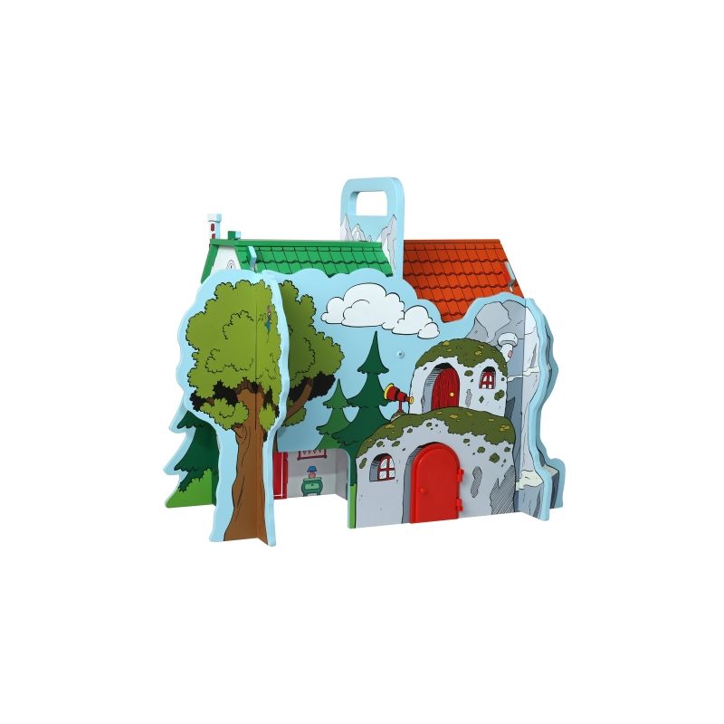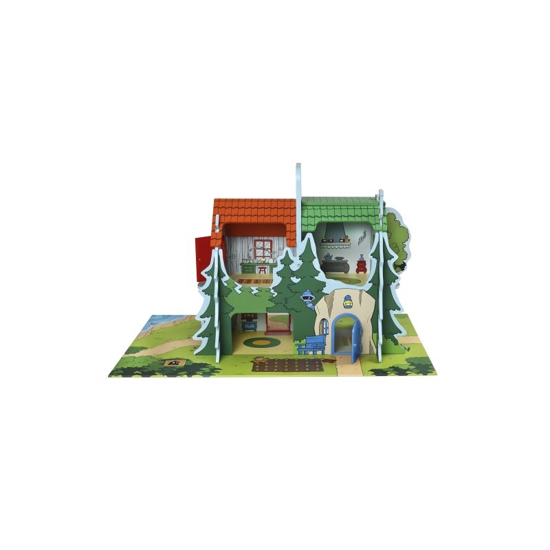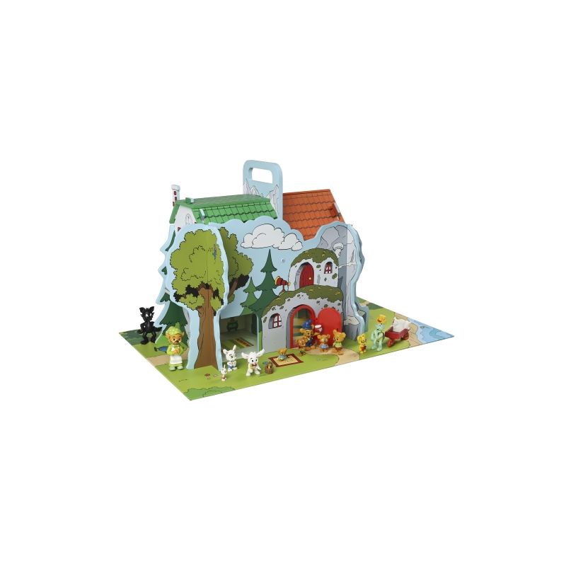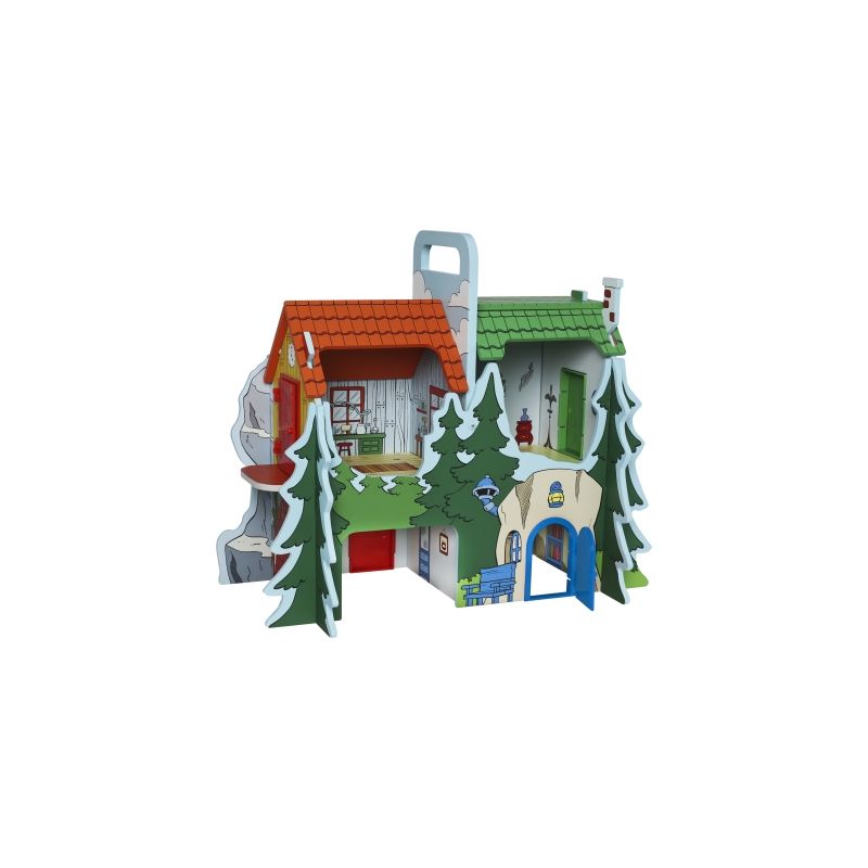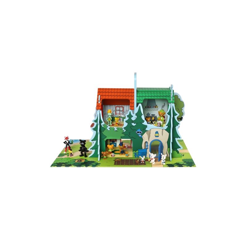 Låt barnen skapa sina egna berättelser i Bamsebyn! Det robusta trähuset rymmer fyra hus i ett. Bamse, Lille Skutt, Skalman och Farmors hus och är gjort för att hålla för oändligt många timmar av lek.