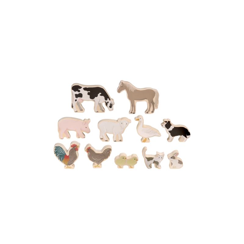 Säg hej till våra leksaksdjur! Det här figursetet i trä erbjuder en rad olika djurvänner som barnet säkert känner igen.