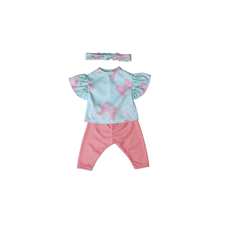 Klädset i glada, lekfulla färger och passar dockor i storlek 41-46 cm. Setet innehåller en t-shirt, byxor och hårband.
