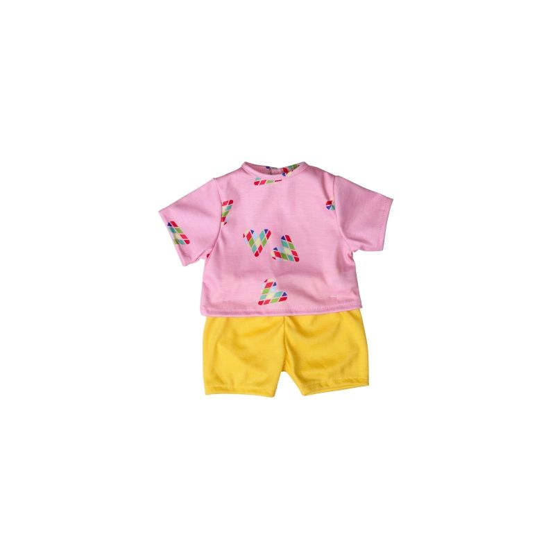 Klädset i glada, lekfulla färger och passar dockor i storlek 41-46 cm. Setet innehåller shorts och t-shirt.