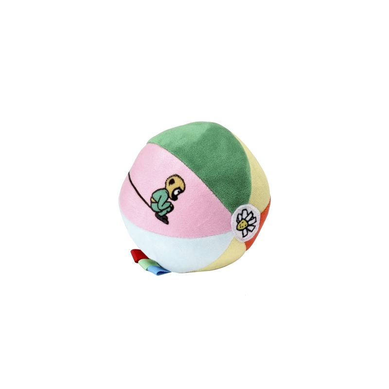 Pippi kikar fram bland färgglada illustrationer, och de små banden runt om fångar genast barnets intresse. Den mjuka formen tillsammans med det pinglande ljudet gör bollen perfekt för de allra minsta händerna att upptäcka.