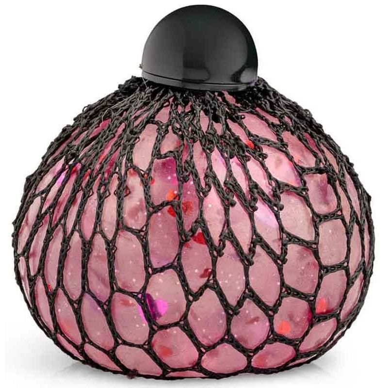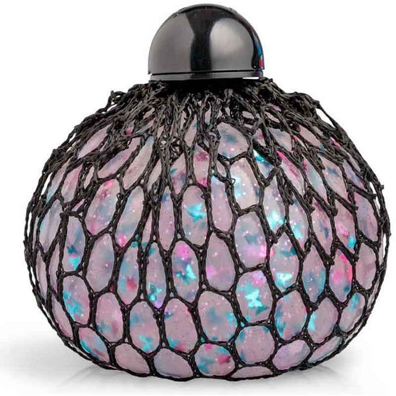 Det är en gelfylld boll som är omgiven av ett nät. När man klämmer den så buktar den ut genom hålen i nätet.