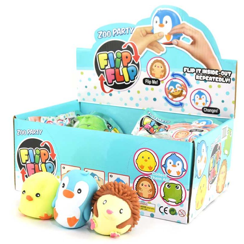 Flip It djur som förvandlas till ett annat djur. Ett skojigt djur som är behagligt att klämma och knåda på. Man kan vända ut och in på djuret och på så sätt få fram ett annat djur. Vilket djur man får blir en rolig överraskning. Djuret är 6,5 cm långt. Antal: 1 st.