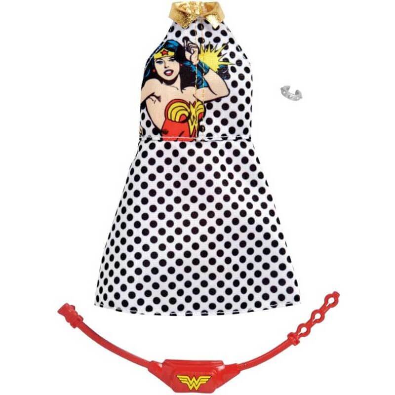Klänningen är vit med svarta prickar på, den har en guldkrage vid halsen och där fram ser man ett tryck som föreställer Wonder Woman. Till klänningen ingår ett silverarmband och en röd midjeväska.