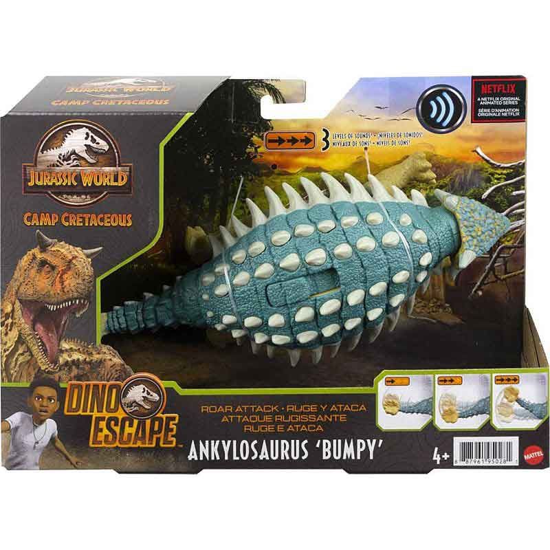 Jurassic World Ankylosaurus Dinosaurie Roar Attack, en häftig leksaksdinosaurie som föreställer en Ankylosaurus som är brun med blå och vita detaljer över ryggen. Leksaken har rörliga leder, roliga ljudfunktioner och fina detaljer för en riktigt rolig lekstund.
