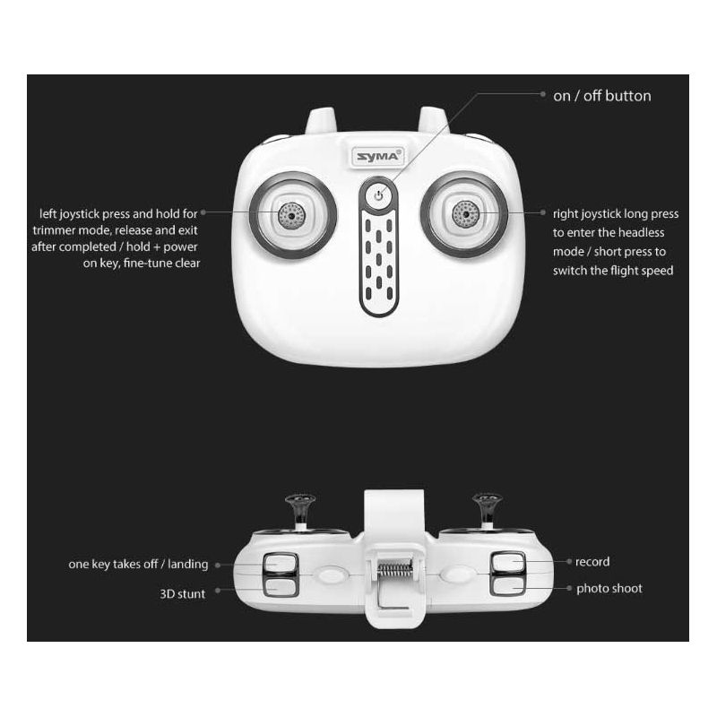 - Styrning sker via handkontrollen eller via en smartphone med Syma-Appen som man kan ladda ned.