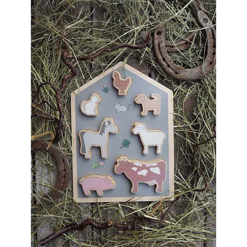 Jabadabado Barnpussel Bondgård. Bondgårdepussel i trä med de vanligaste djuren på gården. Pusselbitarna är extra greppvänliga för att passa små händer. Figurerna är också roliga att leka med.