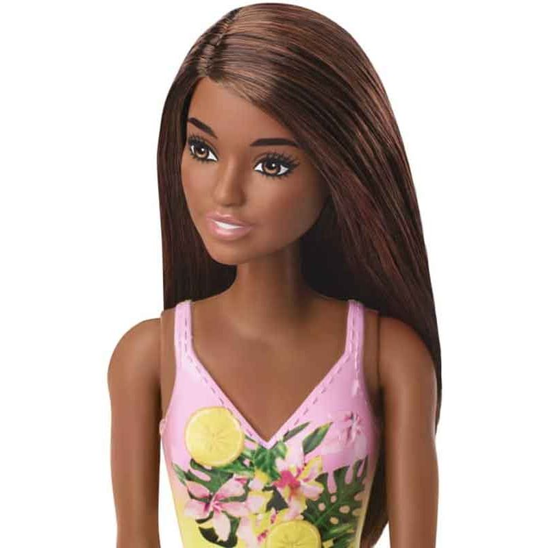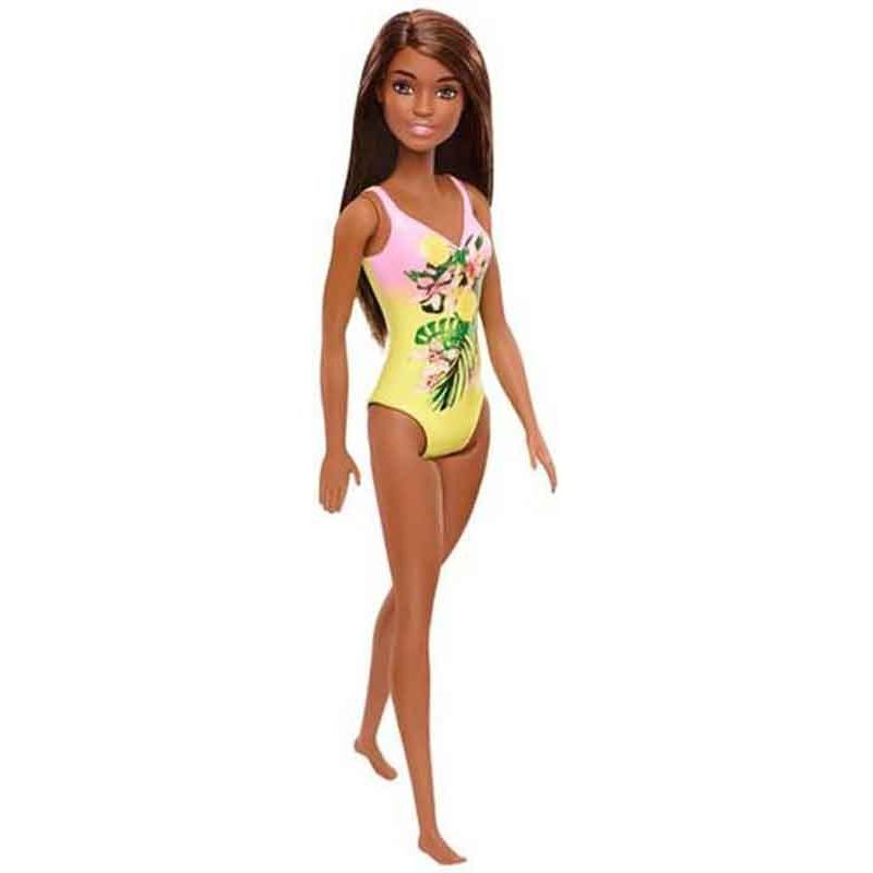 Barbie Stranddocka med gul baddräkt, en superfin docka klädd i en gul och rosa baddräkt med ett härligt blommönster på. Den här dockan är redo för en dag på stranden eller ett uppfriskande dopp i poolen.
