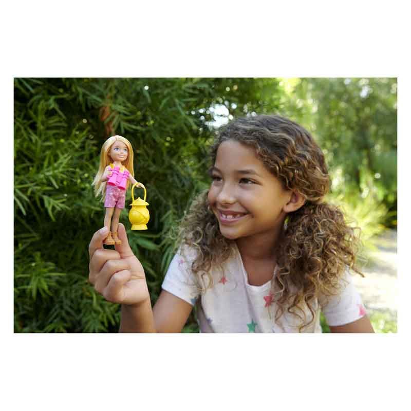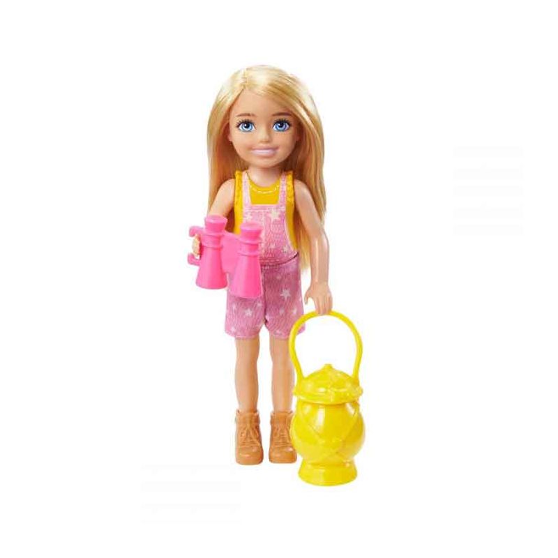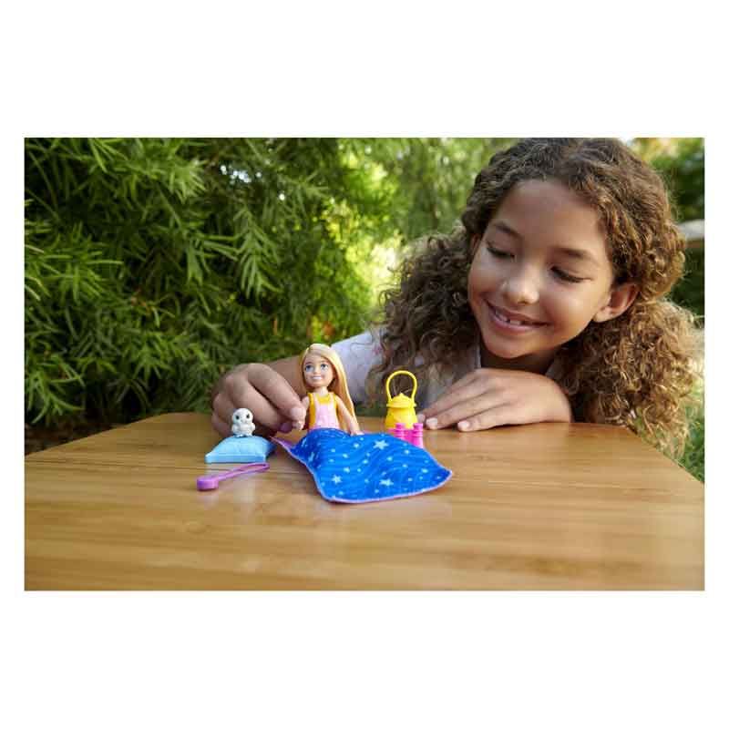 Barbie Chelsea Camping, en jättefin Chelseadocka med ljust hår och blå ögon som barnen kan leka med. Med tillbehören som kudde, och filt ät hon redo för övernattning. Hon har även med sig en kikare, kompass och väska. Den lilla ugglan kommer hålla henne gott sällskap.