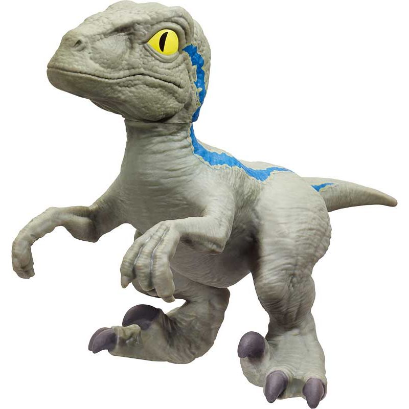 Goo Jit Zu Jurassic World Stretch Blue. Dinosaurier på ett helt nytt sätt. Jurassic World och Goo Jit Zu är sant. De är fyllda med olika häftiga material och gör de till de mest klämbara, sträckbara och superstarka dinosaurierna. Hur långt orkar du sträcka dem? När du släpper återgår den till sin ursprungliga form och storlek. Längd: 18 cm. Höjd: 17 cm.