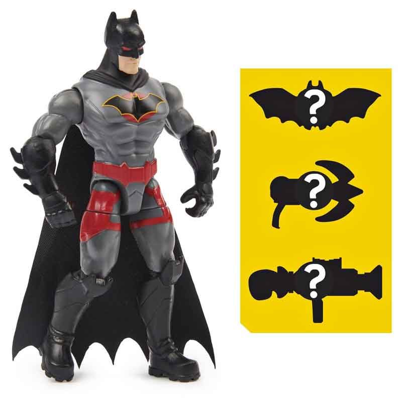 Batman Figur The Caped Crusader, Batman har sin gråa, svarta dräkt med häftiga röda detaljer på sig. Dessutom medföljer det tre häftiga hemliga tillbehör som han kommer använda i striden på Gotahams Citys gator.