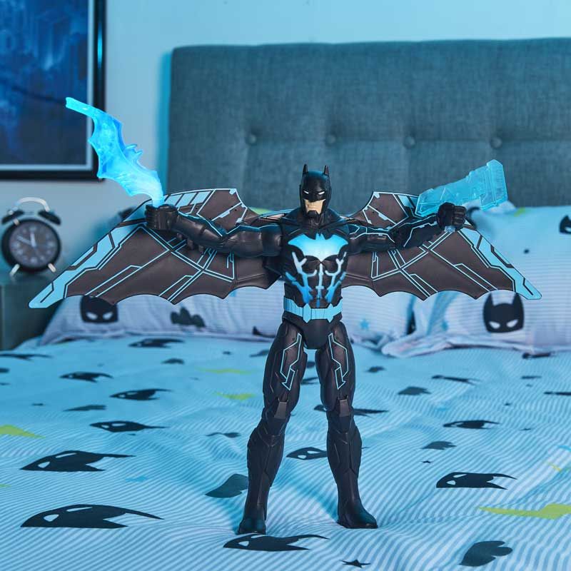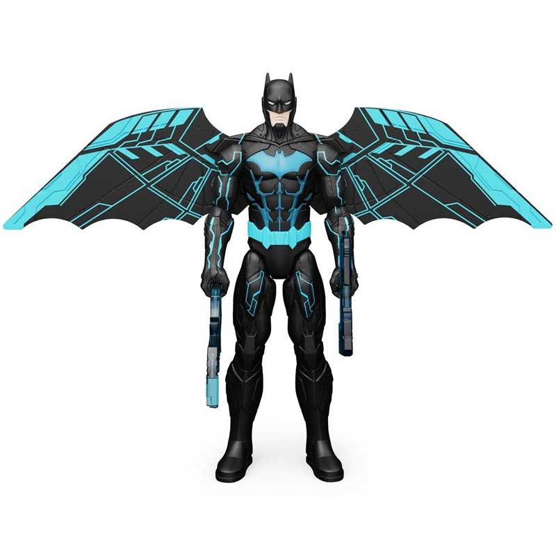 Batman Deluxe Figur Bat Tech med vingar, detta är verkligen en superfin Batman figur med över 20 olika ljudeffekter. Batman flyger nu genom luften på Gothams Gator och bovarna har inte en chans då han överraskar dem från luften.