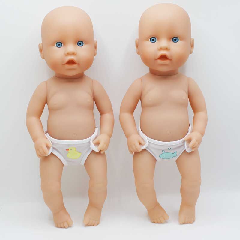 Docka är relativt mjuka av plast. Blöjan kan enkelt tas av och på.