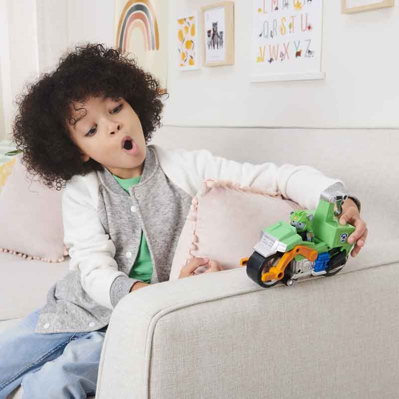 Skynda till räddning med PAW Patrols Rocky och hans Moto Pups Deluxe-fordon. Rockys unika motorcykel har autentiskt tryck och detaljer, stora hjul och drag-bakåt-funktion för att göra wheelies.