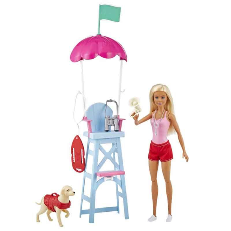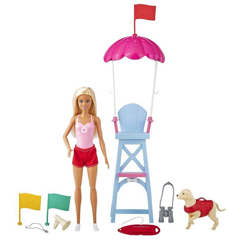 Barbie Lifeguard Lekset, nu är testar Barbie på ett jobb som liväddare på stranden. Hon har sin fina blåa stol med parasoll som skyddar mot solen. Hon är också utrustad med en kikare och en megafon. Megafonen är perfekt då man vill förmedla något till alla på stranden och kikaren för att se ut i vattnet.