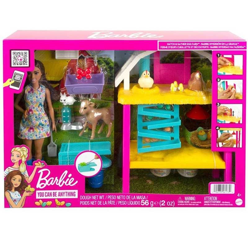 Utforska en värld fullt av nöje på gården med Barbie® Hatch & Gather Egg Farm lekset. En fin Barbie docka ingår, hon bär en söt klänning med mönster av kycklingar och snygga blå stövlar.