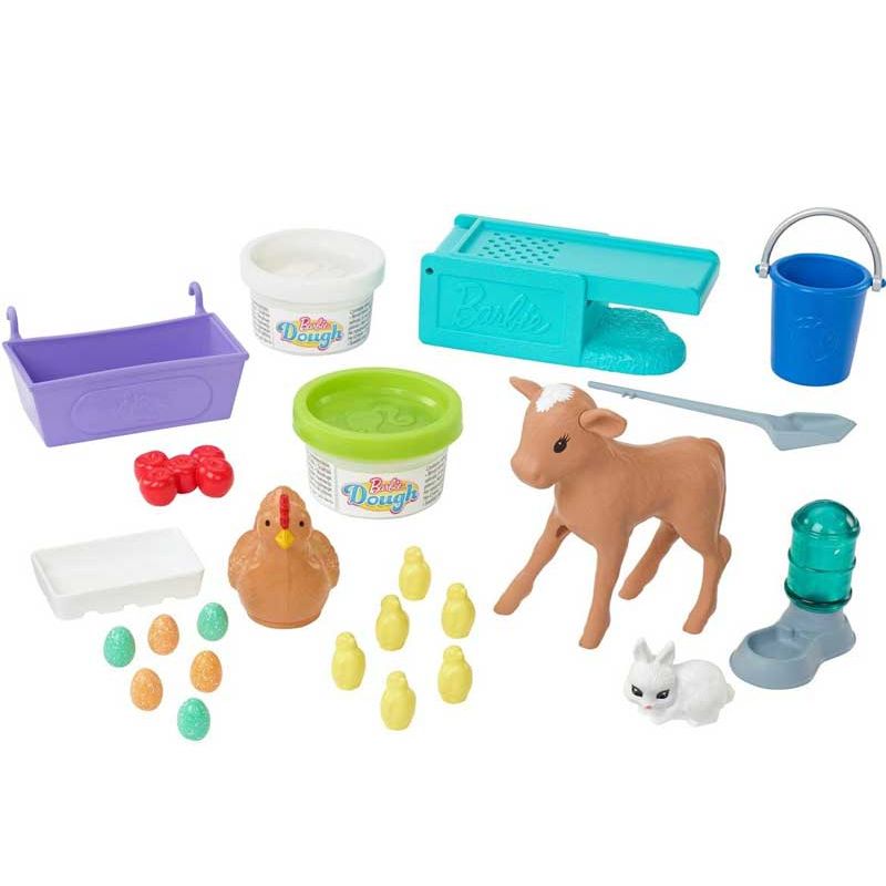 Barbie Hatch & Gather Egg Farm, ett fint lekset med hönsrede, hönor, kycklingar, en kalv och en fin kanin. Barbie tycker om djur och här kan hon sköta om sina djur, ge dem mat och mysa med dem.