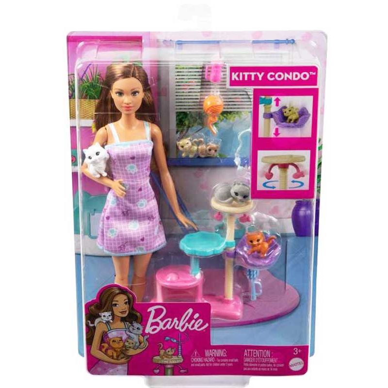 Barbie Kitty Condo Lekset med katter, Barbie gillar att ta hand om sina husdjur. Barn kan hjälpa henne att leka och vårda djuren med Barbie® Kitty Condo lekset!