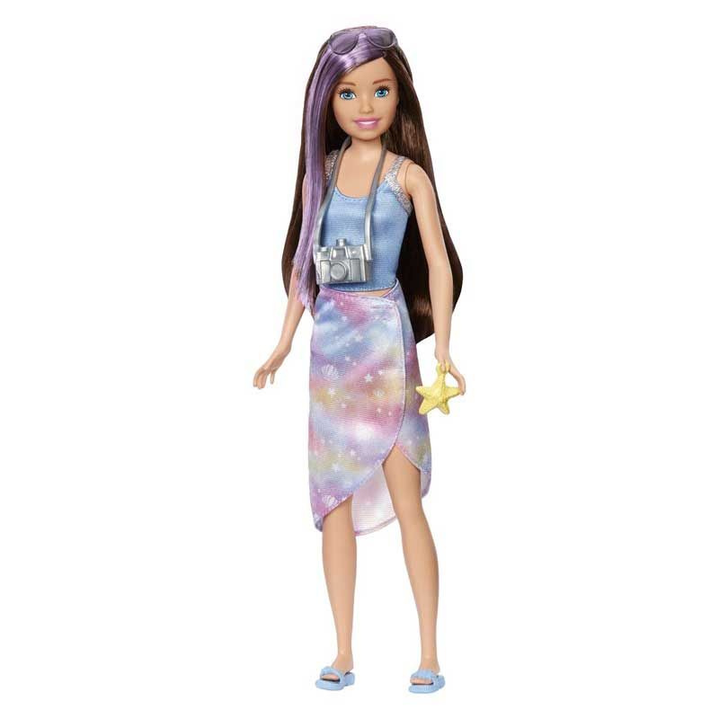 Kom igång med äventyret med Skipper-dockan i en blå och lila baddräkt, en fantasifull fjärilsvän och tillbehör för historieberättande, som en kamera, hörlurar, sjöstjärna och mera. Höjd: 30 cm.