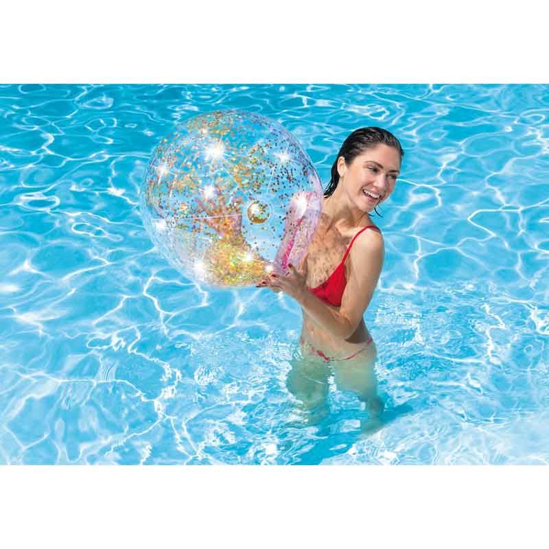 Badbollen är genomskinlig med glitterbitar inuti. Den är 51 cm stor, och ger massa möjligheter för bra lekar både i trädgården, i poolen och på stranden.