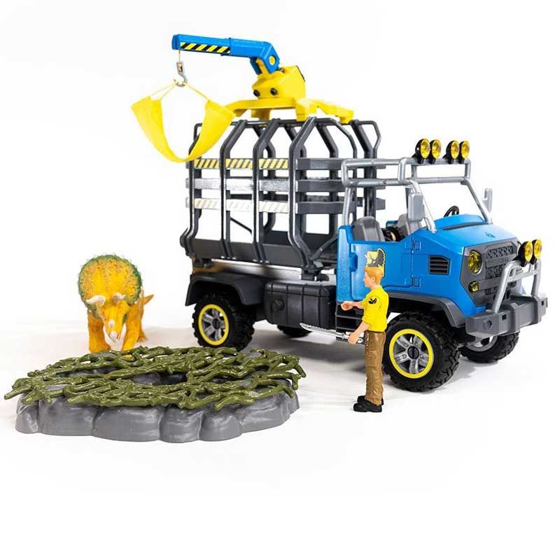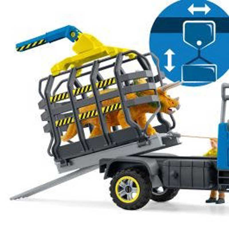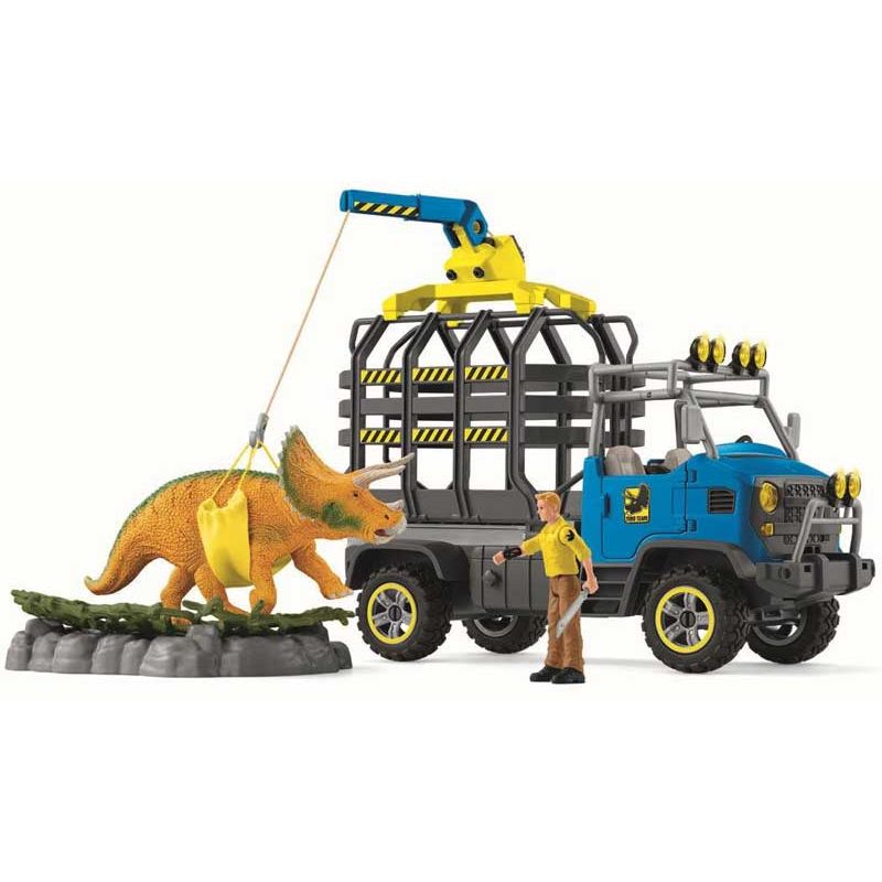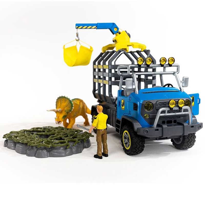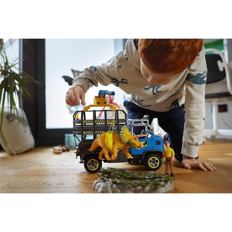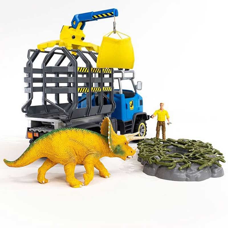 Schleich Dinosaurie transportbil 42565. Åh, nej! När en styracosaurus fångas i ett nät kan lastbilsföraren från schleich® dinosaurielastbilsdelegation skära loss honom från repen på ett ögonblick.