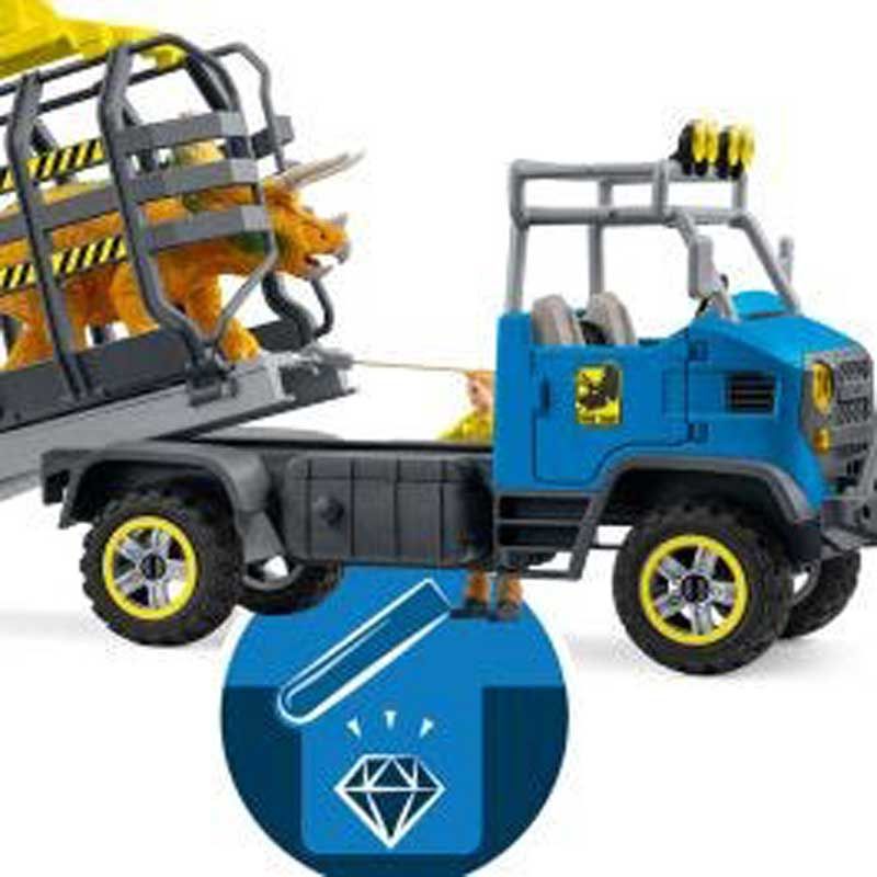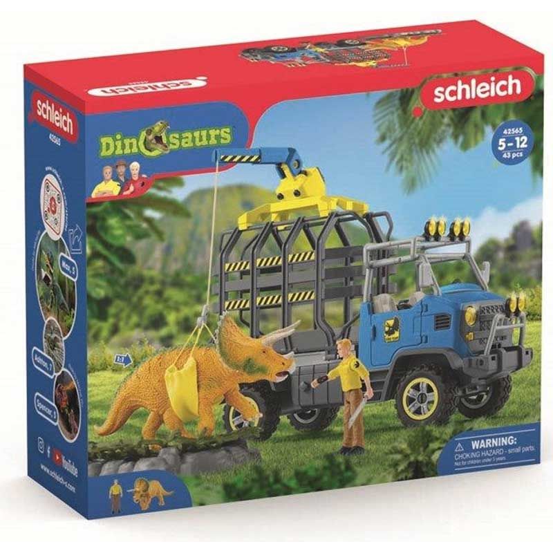 Schleich Dinosaurie Transportbil 42565. Åh, nej! När en styracosaurus fångas i ett nät kan lastbilsföraren från schleich® dinosaurielastbilsdelegation skära loss honom från repen på ett ögonblick. Men akutpatienten vred benet när han räddades och måste omedelbart föras till dinosauriereservatet. Där kan han återhämta sig i lugn och ro. Kan du hjälpa urtidsvarelsen att bli bra igen? Utgått, se andra figurer, klicka här.