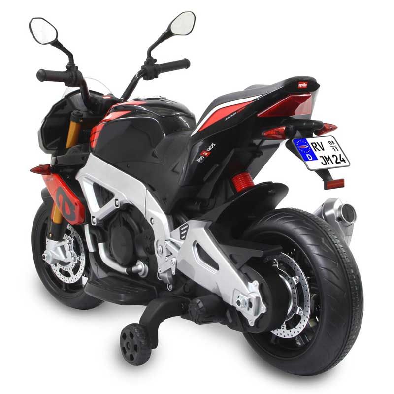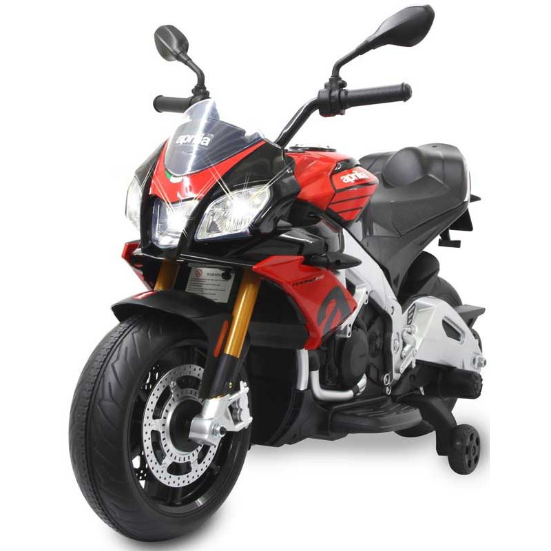 Elmotorcykel Aprilia Tuono V4 1100 RR Röd 12 volt, en superhäftig elmotorcykel till barnen. Den har ljus- och ljudfunktioner.