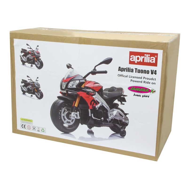 Elmotorcykel Aprilia Tuono V4 1100 RR Röd 12 volt en superhäftig elmotorcykel till barnen. Den har ljus- och ljudfunktioner. Topphastighet ca 5 km/h. Sitthöjd: 45 cm. Jihooo nu åker vi! :)
