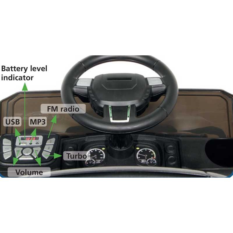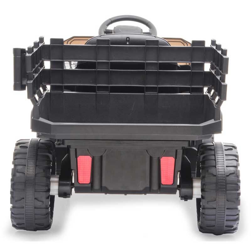 Den drivs av två kraftfulla motorer, en till varje bakhjul. Det ingår en spade i plast, här kan barnen lasta olika saker på flaket och hitta på andra roliga saker.