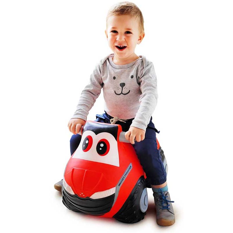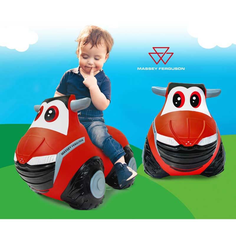 Massey Ferguson studsande hopptraktor med pump. Här kan barnen studsa sig fram med den roliga traktorn. Perfekt för att öva motorik och balans i samband med lek. Ta tag i ytterspeglarna och börja hoppa! Sitthöjd: 27 cm.