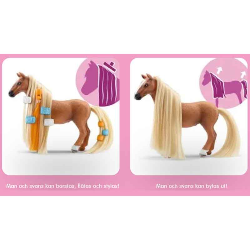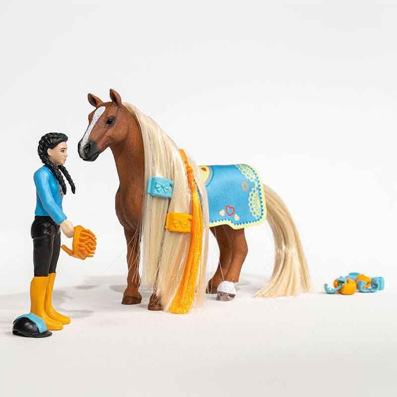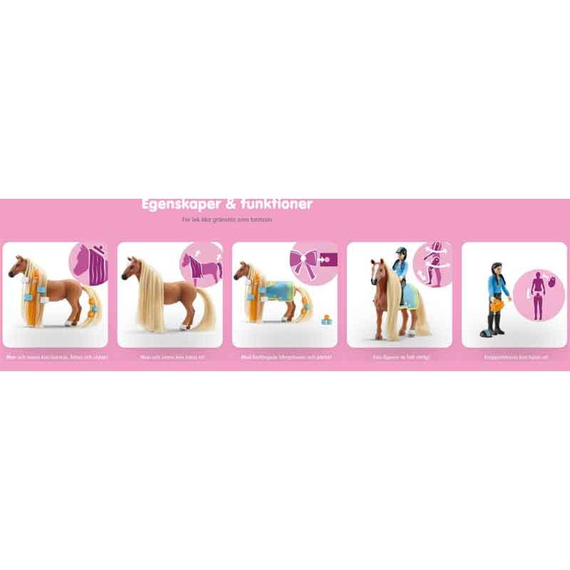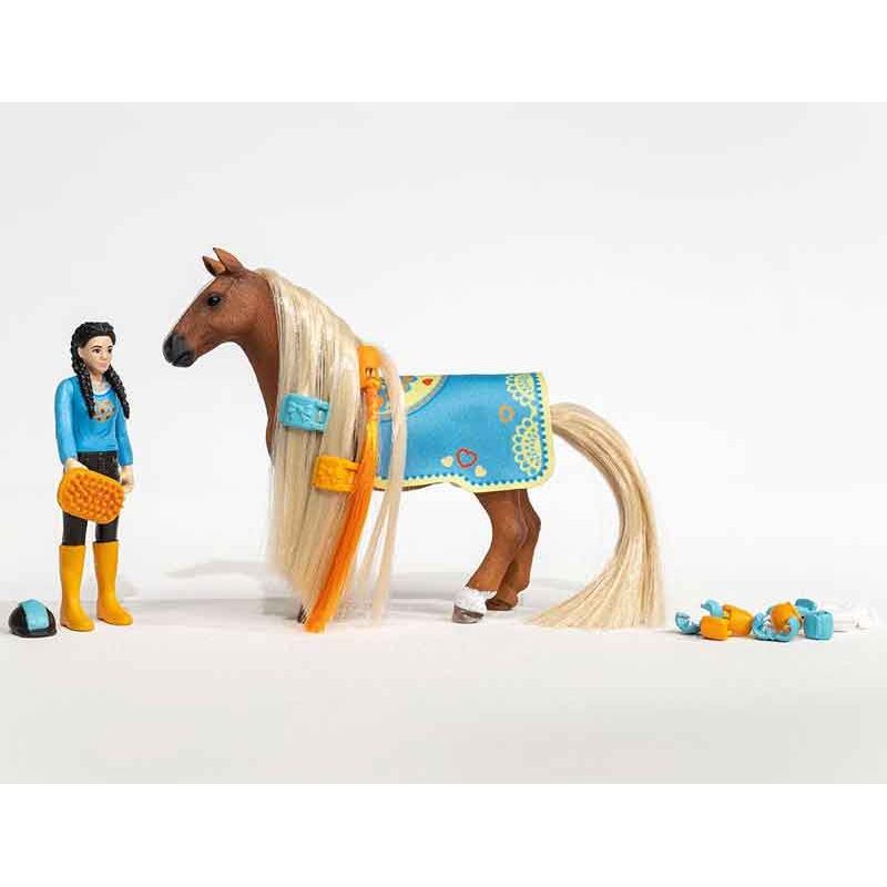 Kim och hennes häst Caramelo från Kim och Caramelo startsats från schleich® HORSE CLUB Sofia’s Beauties älskar båda blått och är bästa vänner. En av få saker som skiljer dem åt är deras frisyr. Men det är bara en tidsfråga. Caramelo håller faktiskt redan på att lära sig hur hon ska fläta sitt hår. Kan du hjälpa henne att kamma? Utgått, se andra hästar, klicka här.