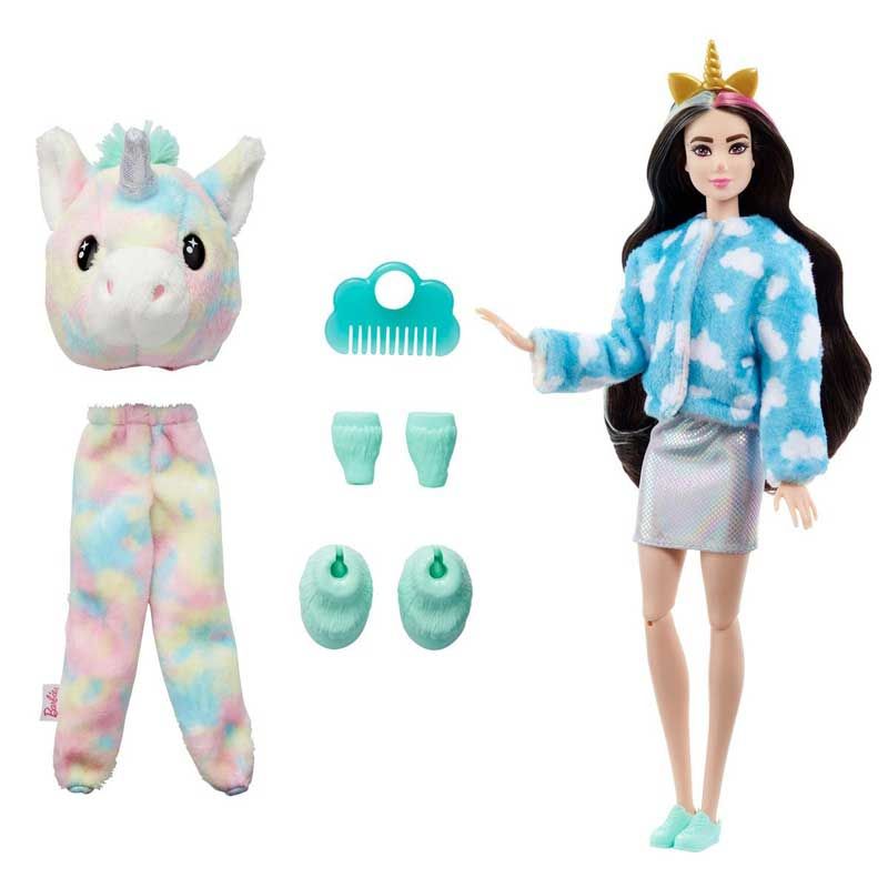 Barbie Cutie Reveal Unicorn Plush Dreamland Fantasy Series med överraskningar. Ta av djurkostymen och hitta en Barbie®-docka med långt hår och glänsande detaljer. Öppna överraskningspåsarna och upptäck skimrande kläder, accessoarer, en svampkam och ett matchande minihusdjur.