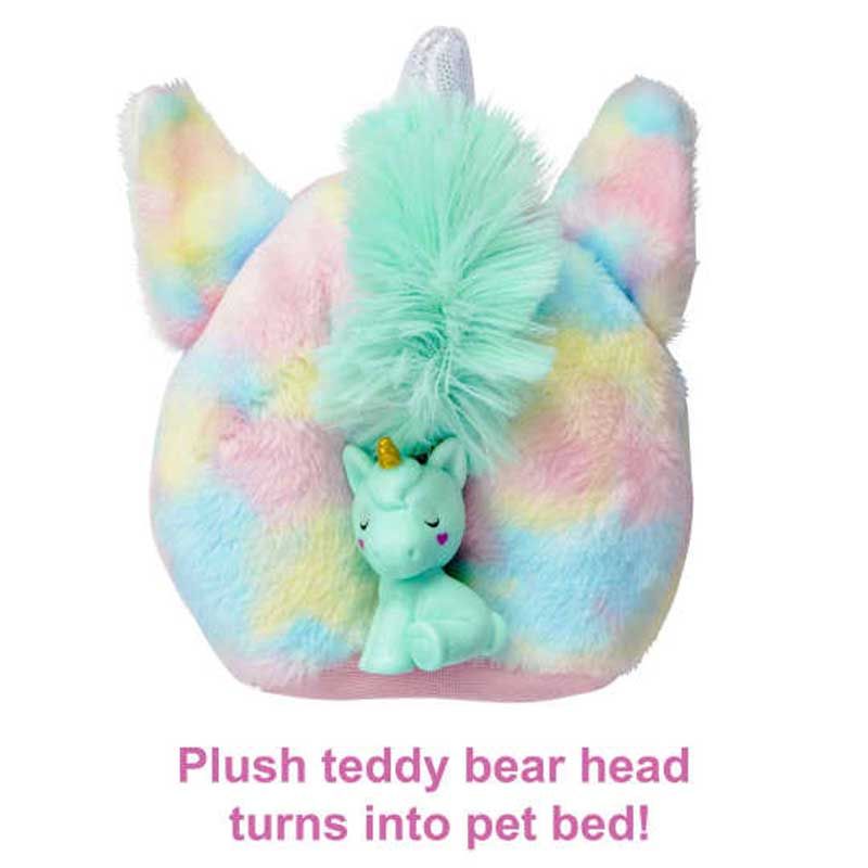 Barn kan klä på och piffa till sin Barbie®-docka. Kostymtoppen är vändbar och blir en supermjuk fleecejacka med ett sött modetryck, och kostymhuvudet förvandlas också till en husdjurssäng!