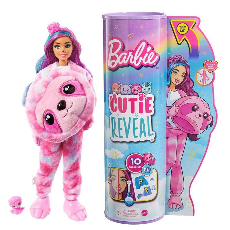 Barbie Cutie Reveal Sloth Plush Costume Dreamland Fantasy Series med överraskningar. Ta av djurkostymen och hitta en Barbie®-docka med långt hår och glänsande detaljer. Öppna överraskningspåsarna och upptäck skimrande kläder, accessoarer, en svampkam och ett matchande minihusdjur.