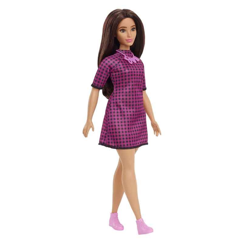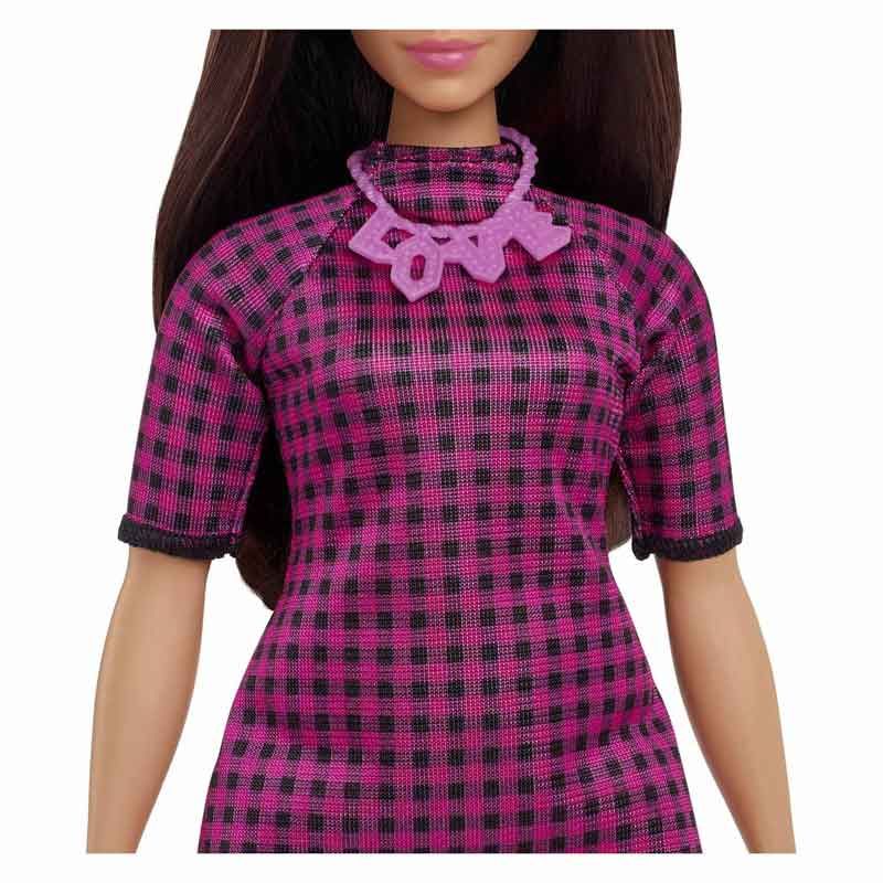 Barbiedocka Curvy Fashionista Pink Checkers. Barbie har en underbar klänning på sig, med ett tillhörande rosa halsband. Till detta ett par rosa fina skor. Nu är hon redo för en träff med vännerna. En fin Barbiedocka från den populära Fashionistas serien som består av dockor som alla är unika på sitt sätt. De har olika kroppstyp, hudfärg, hårfärg, längd och ögonfärg. Utgått, se andra Barbiedockor, klicka här.