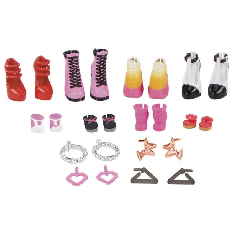 A. Mall B. Donut Case C. 3 Donuts D. 2 Cups E. Cup Holder F. Register G. 4 Pairs of Shoes (for O.M.G. dolls) H. 4 Pairs of Shoes (for tot dolls) I. 4 Pairs of Earrings J. 4 Purses K. 3 Shopping Bags with Tissue Paper L. 4 Clothes Hangers M. 3 Sunglasses (Dolls not included.)