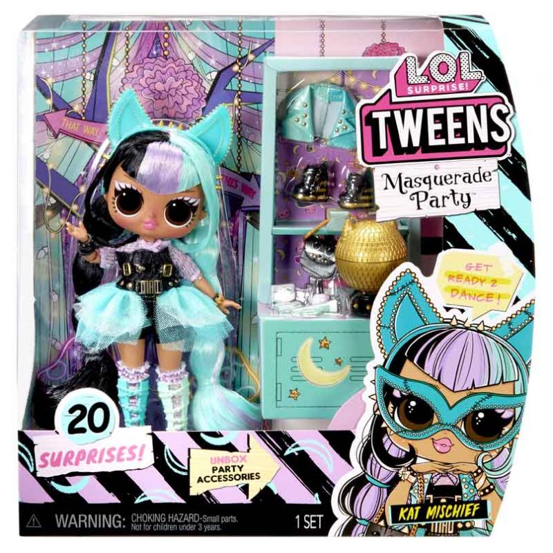 L.O.L. Surprise Kat Mischief Tweens Masquerade Maskeradtema. Vem är det bakom masken? Möt L.O.L. Surprise! Tweens dockorna som är på väg till en maskeradbal. Storlek docka höjd ca 16,5 cm. Utgått, se andra dockor, klicka här.