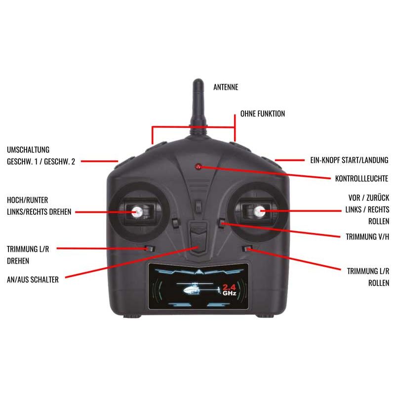 - Den har en 4-kanals rotor som styrs med 2,4 Ghz handkontroll, för bästa kontroll och funktion.