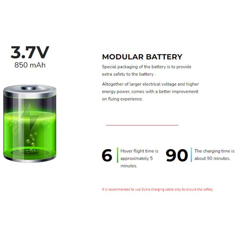 - Drönare: Det ingår ett uppladdningsbart batteri Li-Po 3,7 volt, 380 mAh.