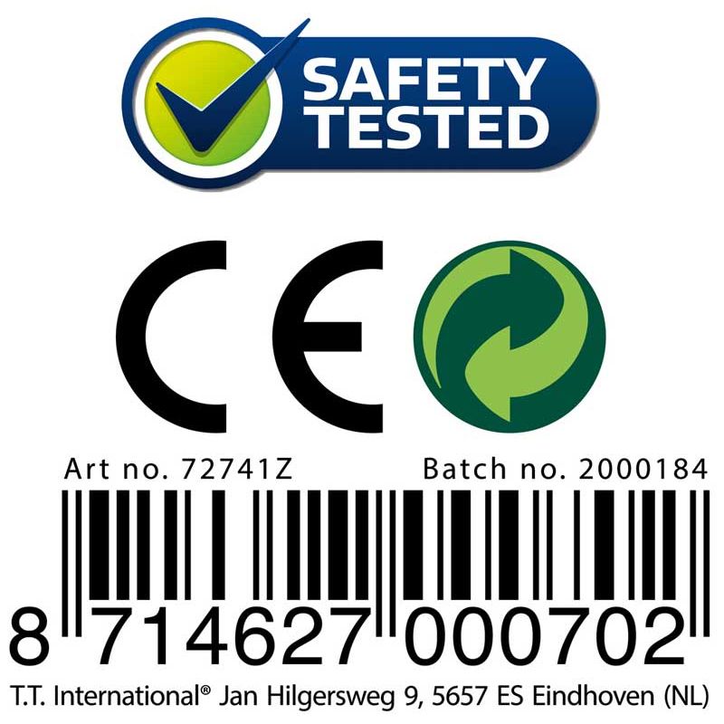 - CE-Märkt och godkänd enligt EN 71, alla tester, lagar och regler.
