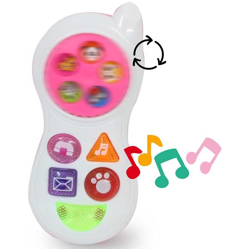 Telefonen har flertalet knappar som ger ifrån sig olika ljud och ljus, som ringsignal, melodier, djurläten mm. Den rosa runda delen på telefonen går också att snurra på och där finns även mysiga bilder på olika djur.