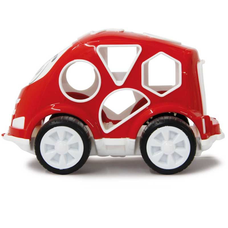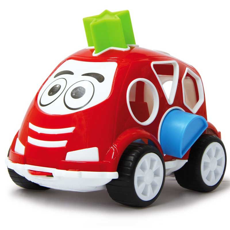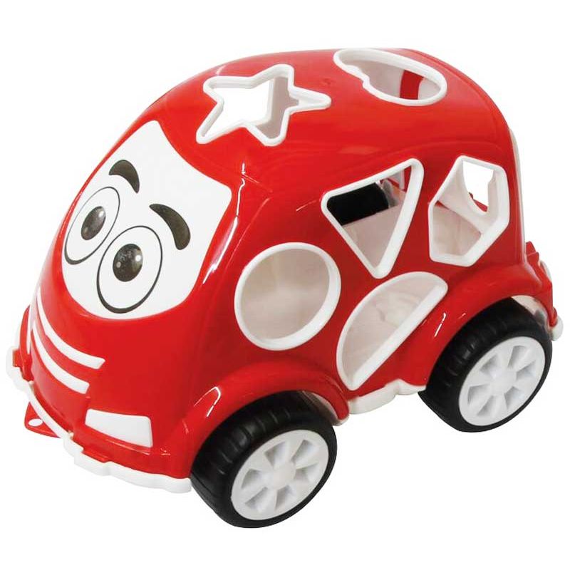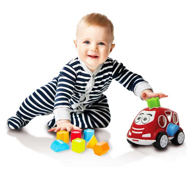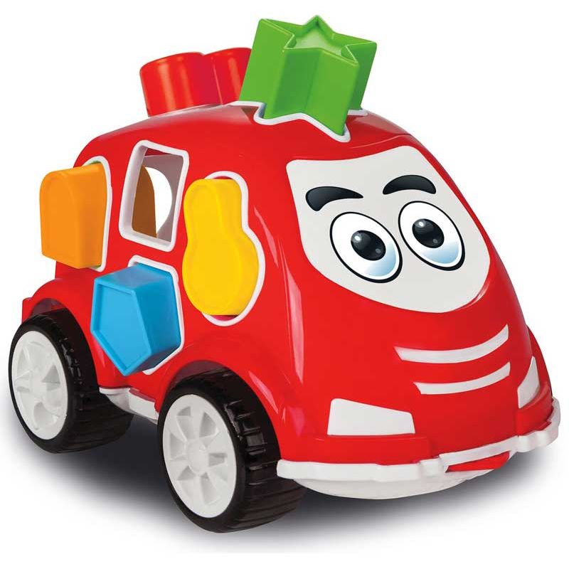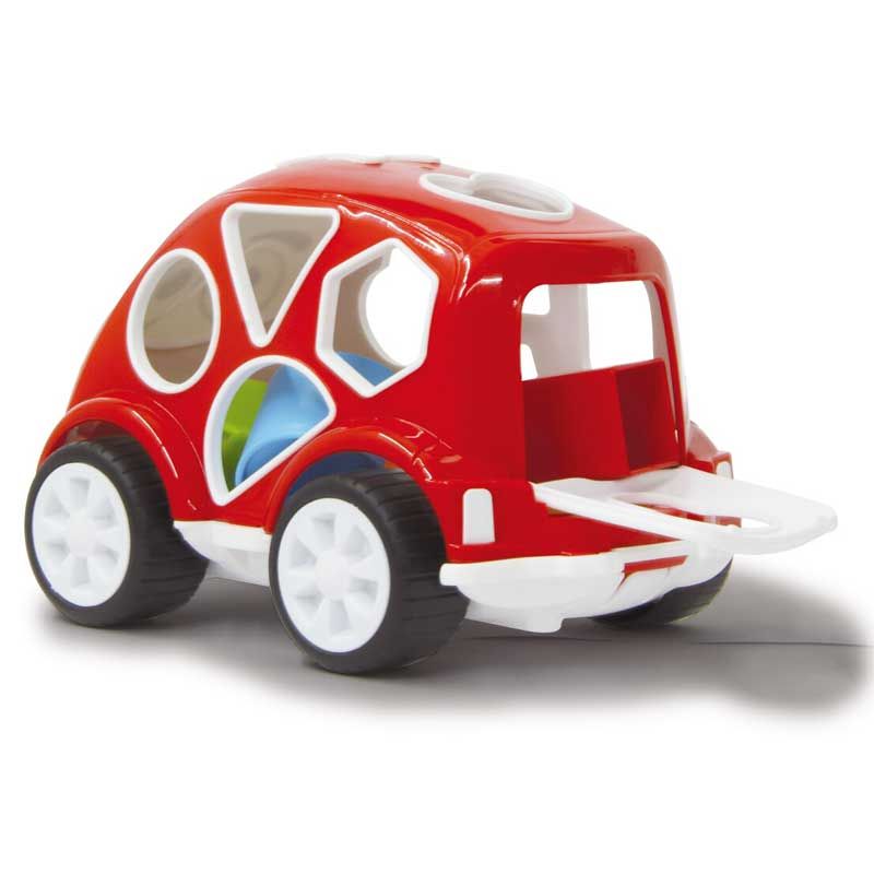 Den röda bilen är också en plockbil med fina klossar i olika färger och former. Så här får barnen försöka lägga rätt kloss i rätt hål. En vuxen eller kanske ett äldre syskon kan lära barnen namn på färger och namn på geometriska former.