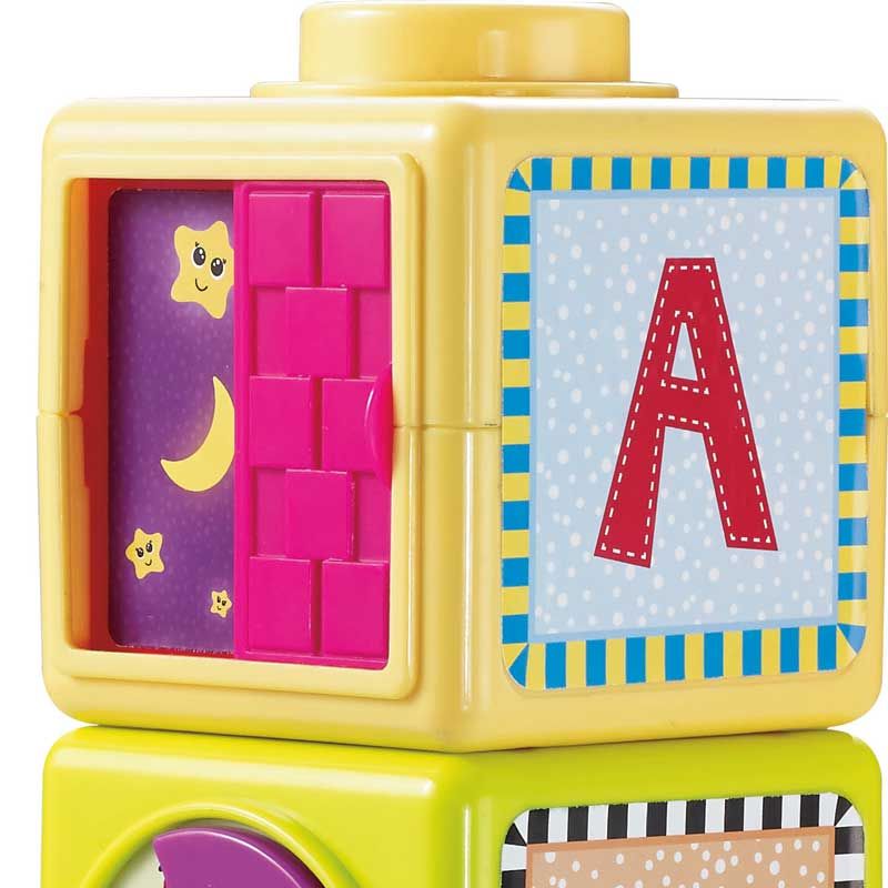Dessa färgglada klossar har också siffror, bokstäver och med olika symboler, former på klossarna. En vuxen person eller äldre syskon osv. kan därför vara med och även lära barnet namnen på allt.