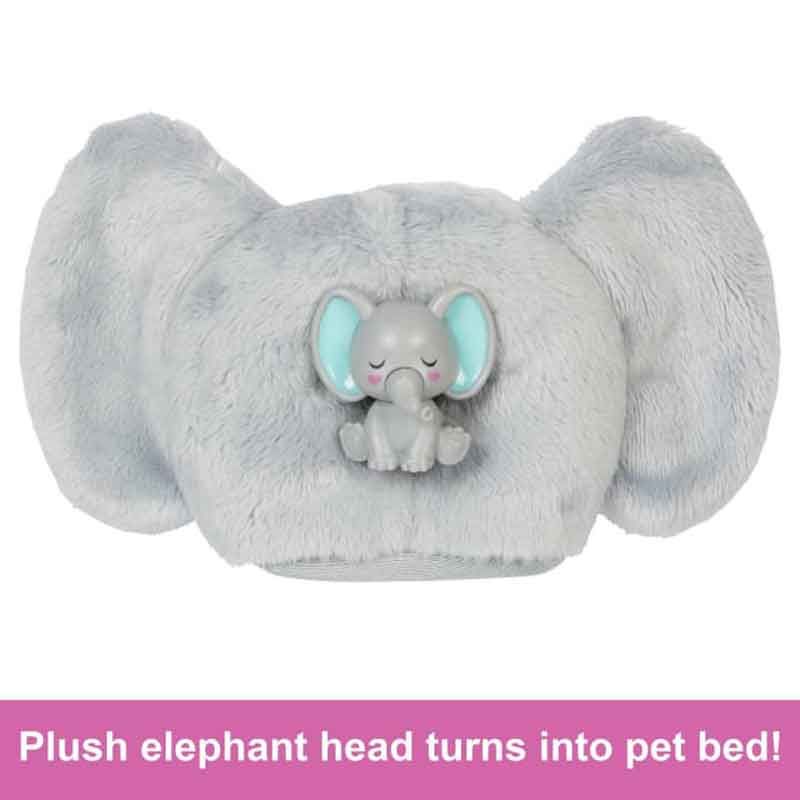 Upptäck en charmig elefant, ta sedan bort plyschdräkten för att avslöja en justerbar Barbie®-docka med långt, färgglatt hår.