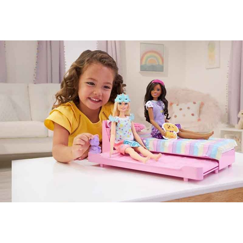 Dess läggdagslekset har en pastellrosa rullsäng som passar två My First Barbie™-dockor.