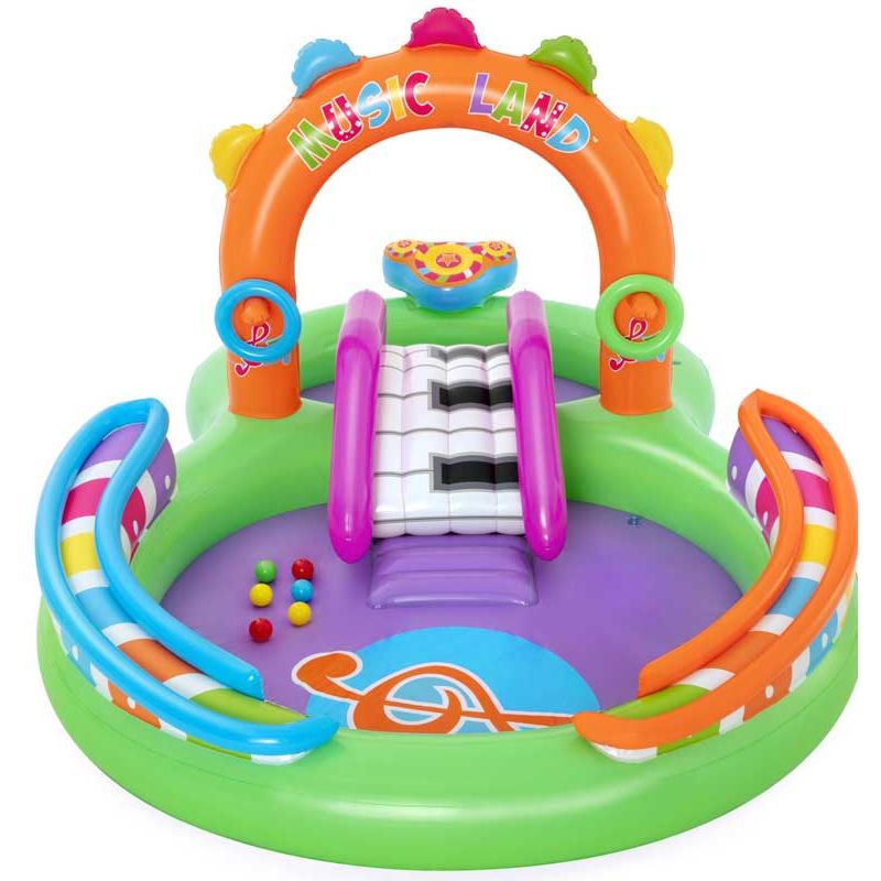 Lekpool Sing n Splash Vattenland, kolla in detta superroliga vattenland för barnens utomhuslek på sommaren. En skojig barnpool med rutschbana och vattenspinkler. Det medföljer även bollar och ringar man kan kasta. Helt perfekt att ha i trädgården en varm sommardag. Storlek 295 x 190 x 137 cm