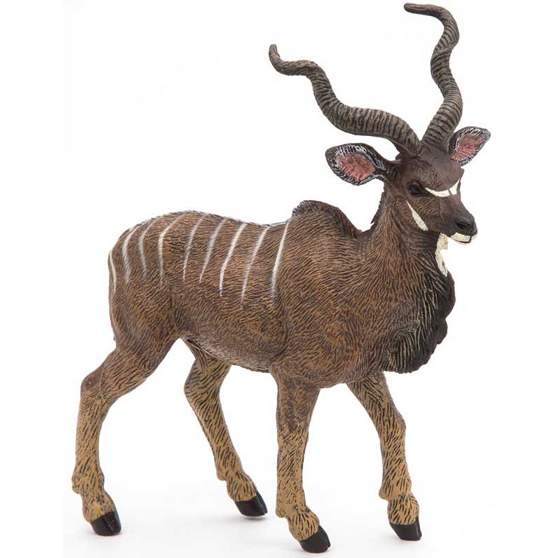 Papo Större kudu. Great kudu. Den större kudun är Afrikas näst största antilop, med en mankhöjd på runt 150 cm. Den är för det mesta aktiv på morgonen och på kvällen då den söker föda. Mitt på dagen brukar den ligga i skuggan och vila. Längd: 13 cm. Utgått, se andra Leksaksdjur, klicka här.