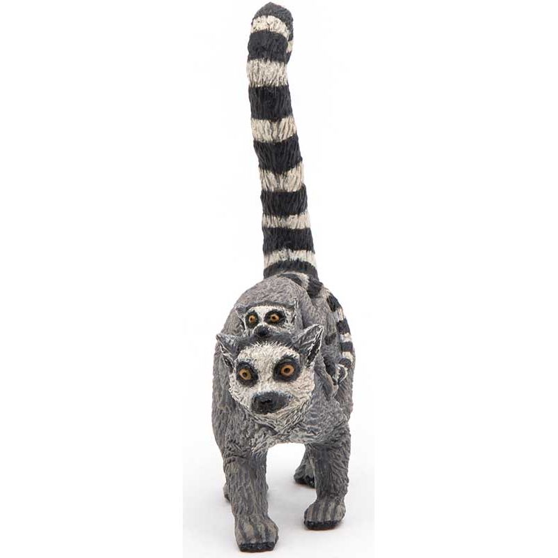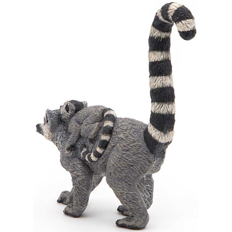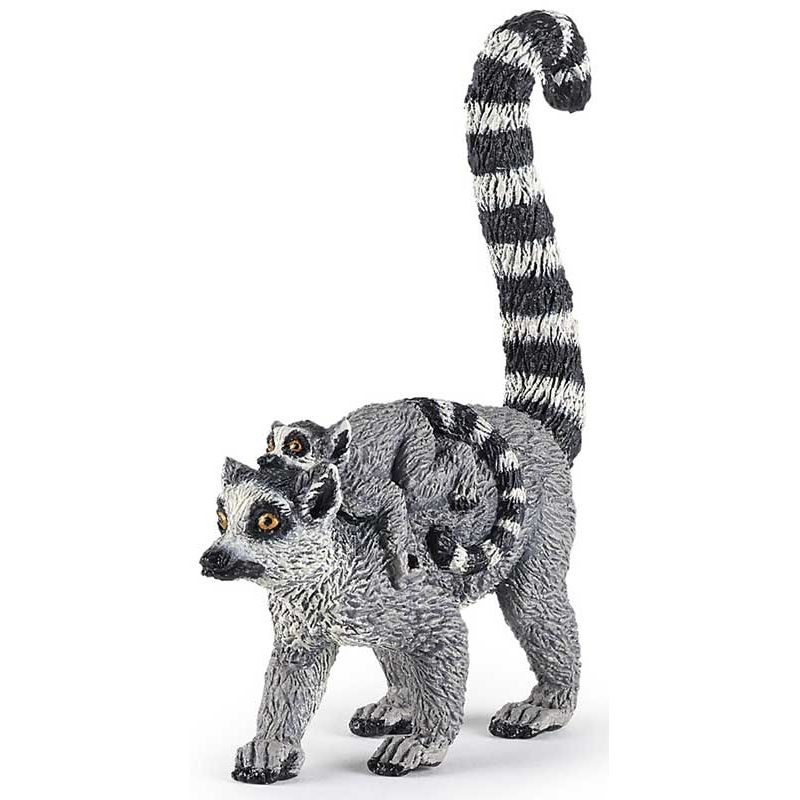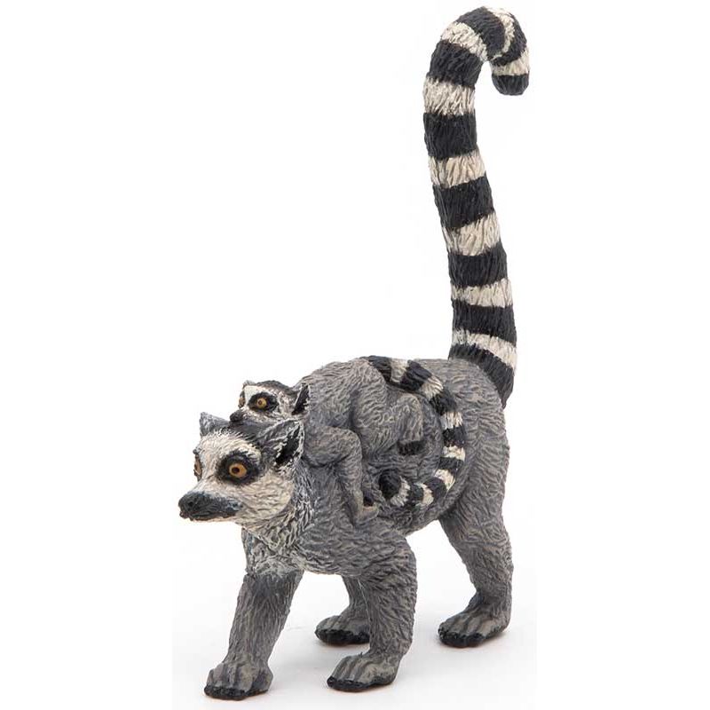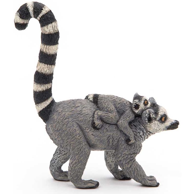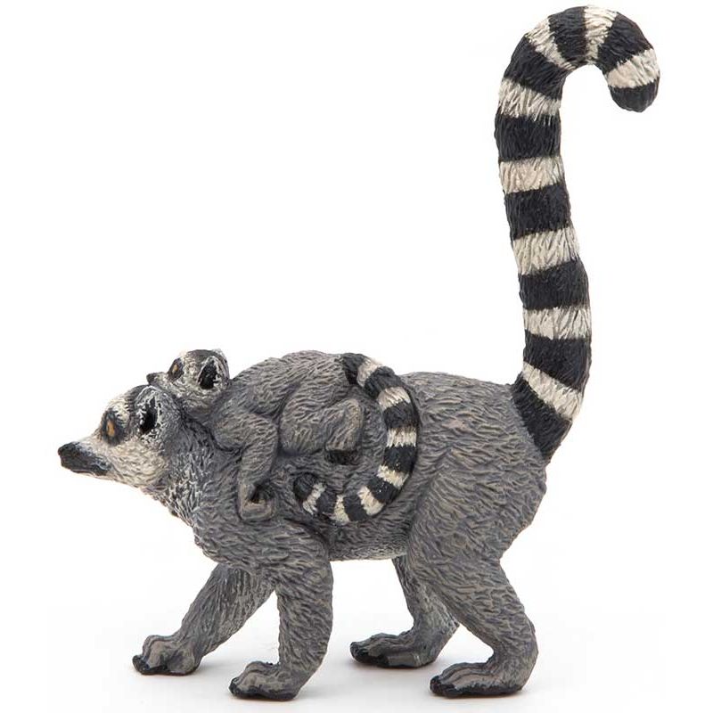 Papo Lemur med unge Leksaksdjur. Djuret utmärks av ett långsträckt huvud, som liknar rävens, med ganska stora ögon och öron. Utmärkande är lemurens randiga svans som är längre än kroppen med mjuk, och ullig päls. Vikten varierar mellan 2-3,5 kg. Längd: 6 cm. Utgått, se andra leksaksdjur, klicka här.