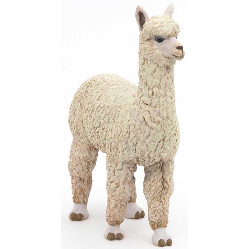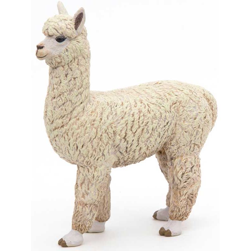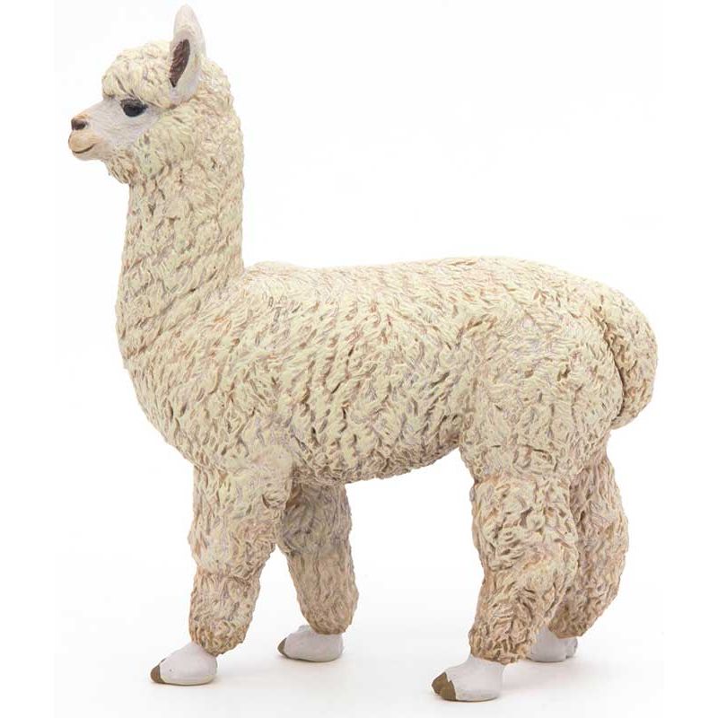 Papo Alpacka Leksaksdjur. Alpacka är ett domesticerat kameldjur från Anderna som är besläktat med vikunja. De avlas främst för sitt mycket fina hår som ofta kallas alpackaull. Alpackan förekommer i Anderna i områden i Ecuador, norra Bolivia, norra Chile och södra Peru. Längd: 8 cm. Utgått, se andra leksaksdjur, klicka här.