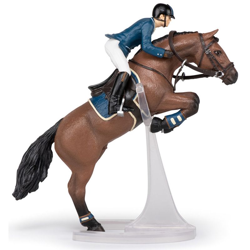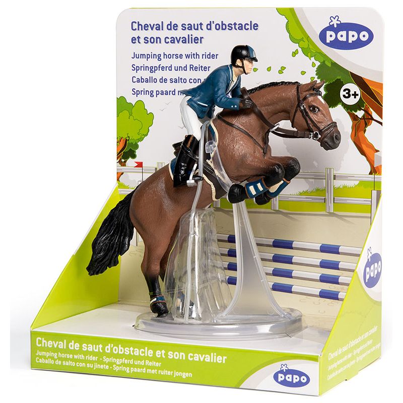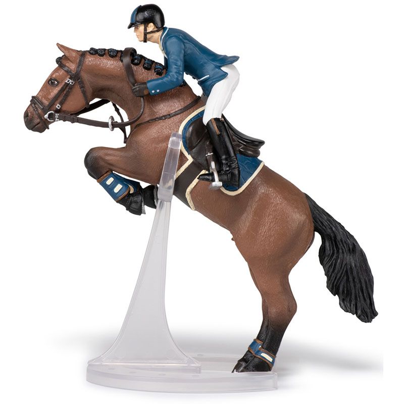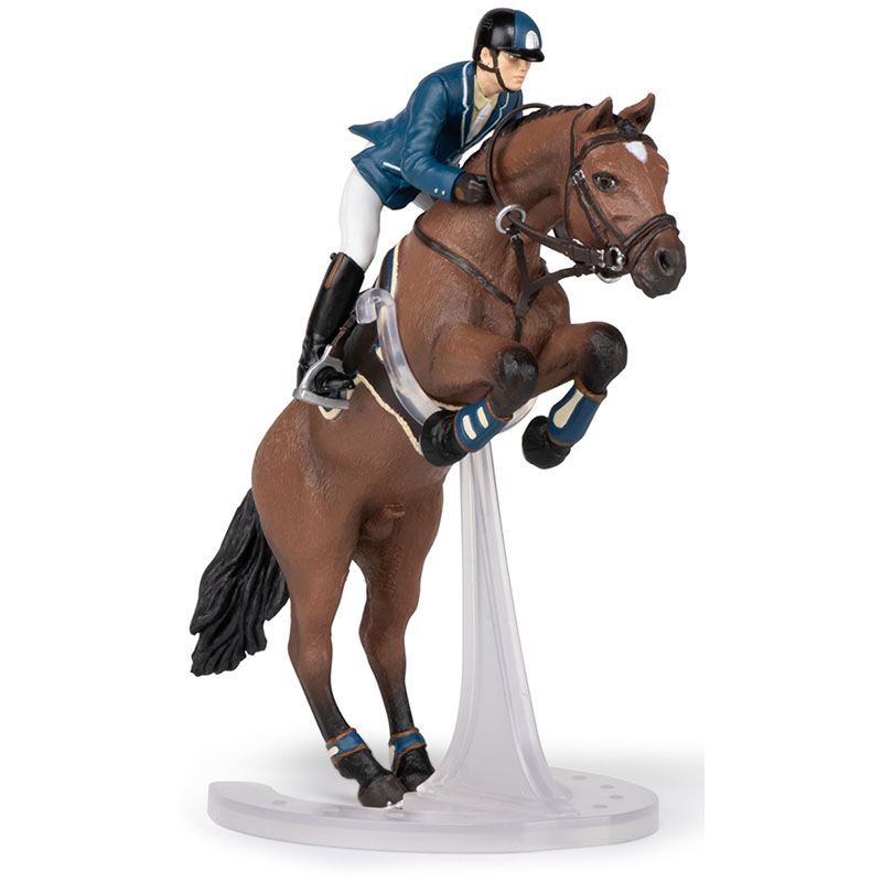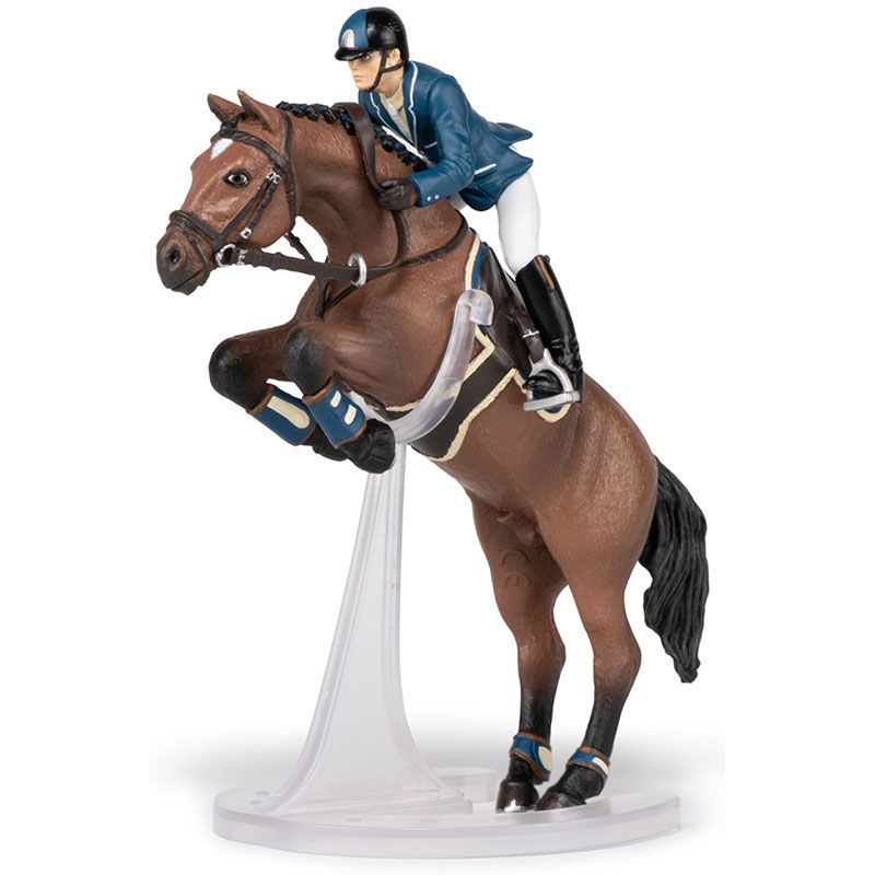 Papo Hoppande Oldenburgare med tävlingsryttare herr. Oldenburgaren är en hästras som började utvecklas under 1600-talet i Tyskland. Längd: 16 cm. Höjd: 19 cm. Utgått, se andra leksaksdjur, klicka här.